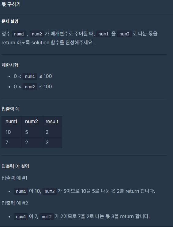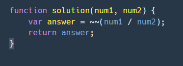 2.num1을 num2로 나눈 결과를 answer 변수에 저장합니다. 이때 ~~ 연산자는 소수점 이하의 값을 버리고 정수 부분만 남기는 역할을 합니다. (~가 하나만 있을 경우에는 -(n+1)을 합니다.)