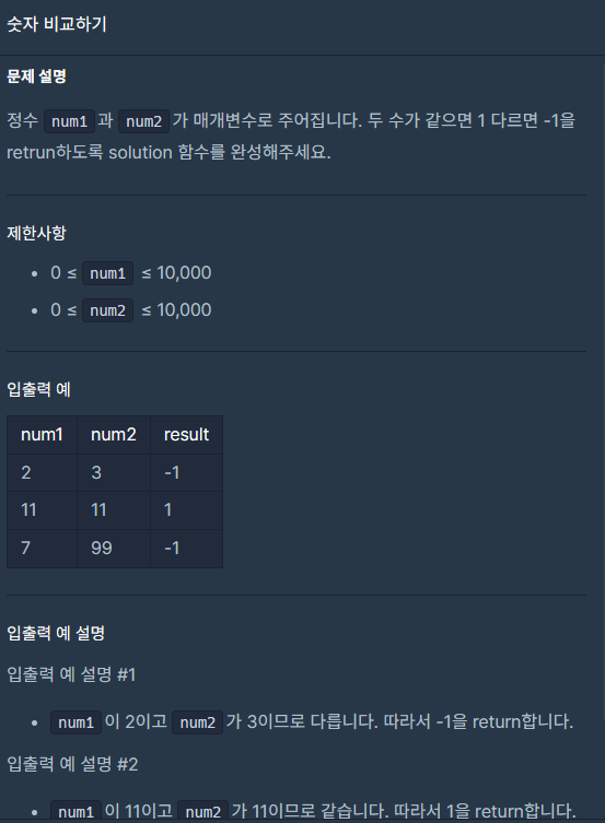 조건문 if를 사용하여 num1과 num2가 같을때 (==, ===) return 1값을 반환하고, 다를 경우 return -1을 반환합니다.
