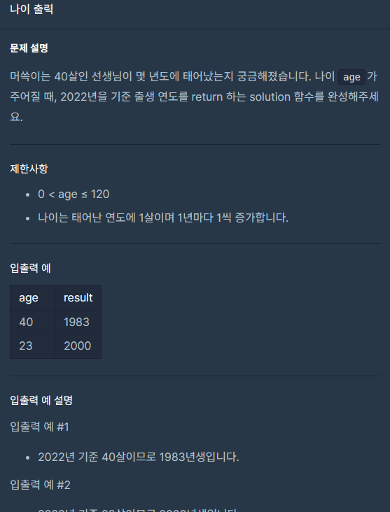 주어진 age에 따라 2023년(2022년에서+1을 해 주었습니다.)에서 해당 age를 뺀 값을 계산하여 반환하는 계산입니다.