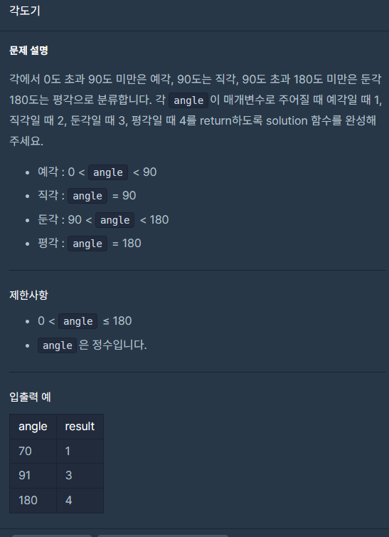 만약 첫번째 조건문이 맞지 않는다면 또 다시 조건문을 넣어angle이 90과 같은 경우, 2를 반환합니다.