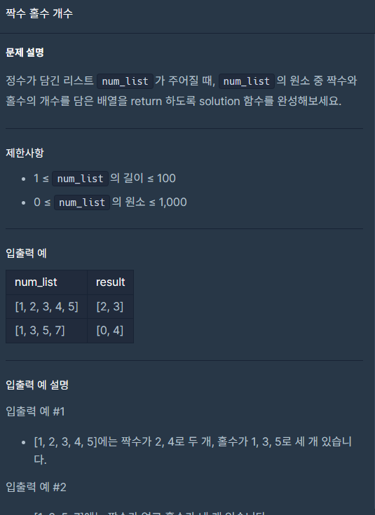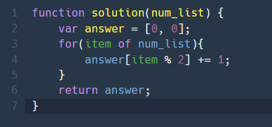 2. answer라는 변수를 [0, 0]으로 초기화합니다. answer는 홀수와 짝수의 개수를 담은 배열로 [짝수의 개수, 홀수의 개수] 형태를 갖습니다.
