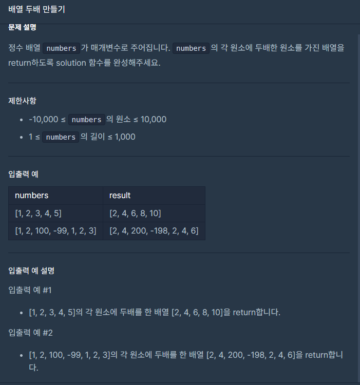 2. numbers 배열의 각 요소를 순회하면서 새로운 배열을 생성합니다.