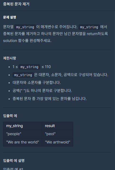 1 .[...new Set(my_string)]을 사용하여 문자열 my_string을 Set 객체로 변환합니다. Set은 중복을 허용하지 않는 유일한 값을 저장하는 객체입니다. 이를 통해 중복된 문자들이 제거됩니다.