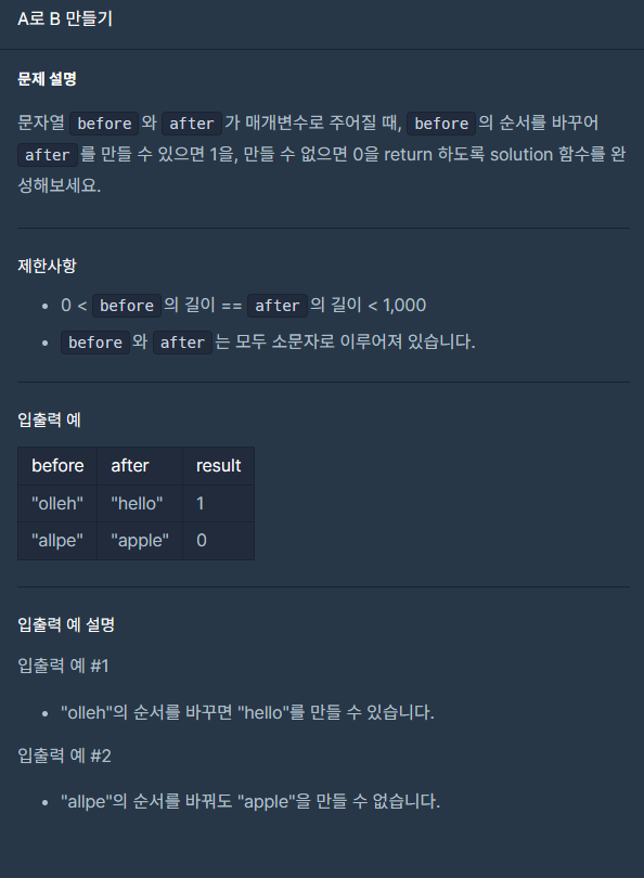 4. before와 after를 정렬 및 결합한 문자열을 비교하여 같은지 확인하여, 같으면 1을 반환하고, 다르면 0을 반환합니다.