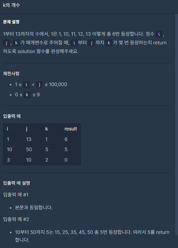 return Array(j-i+1).fill(i).map((v,index) => v + index).join('').split(k).length -1