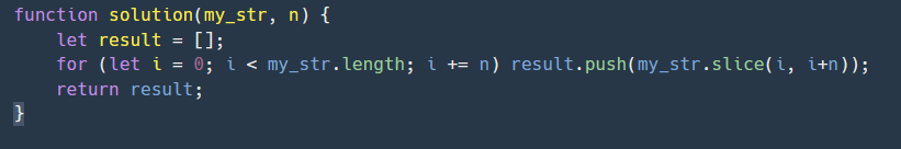 for (let i = 0; i < my_str.length; i += n) result.push(my_str.slice(i, i+n));