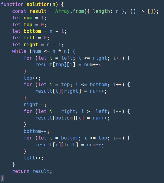 5. 반복문이 완료되면 배열에는 숫자가 나선형으로 배치되어 있습니다. 이 배열을 결과로 반환합니다.