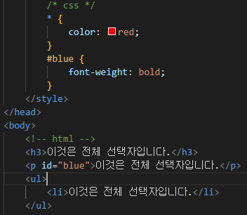 ※불필요하게 전체 선택자를 사용하는 것은 속도 저하의 원인이 되므로 반듯이 필요한 경우가 아니면 선택자를 명시하는 것이 좋습니다.