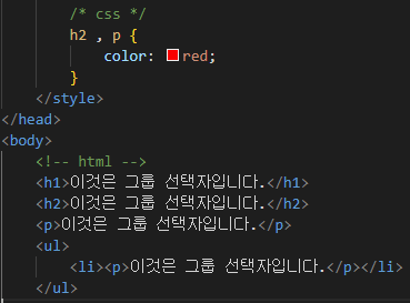 ※여러 선택자들을 함께 묶어 속성을 부여합니다.