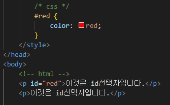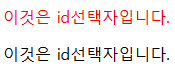 ※html 요소에id로 이름을 붙일 때에는 유일한 이름을 부여해야 하며, 다른 요소에 같은 id를 주어서는 안됩니다.※css에서는 id 선택자 앞에 '#'을 붙여야 합니다. id명은 숫자로 시작할 수 없으며, 주로 영문자로 시작합니다.