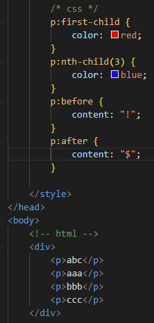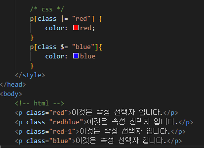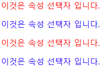 | p[class$="abc"] | class명이 철자 'abc'로 끝나는 p요소 |