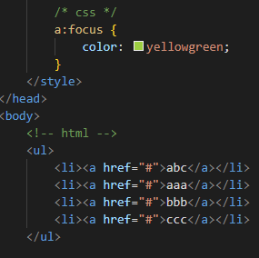 | a:focus | 링크 걸린 글자에 포커스가 생길 경우의 속성을 부여하는 선택자 (키보드의 [Tap]키 등으로 포커스가 나타날 경우) |