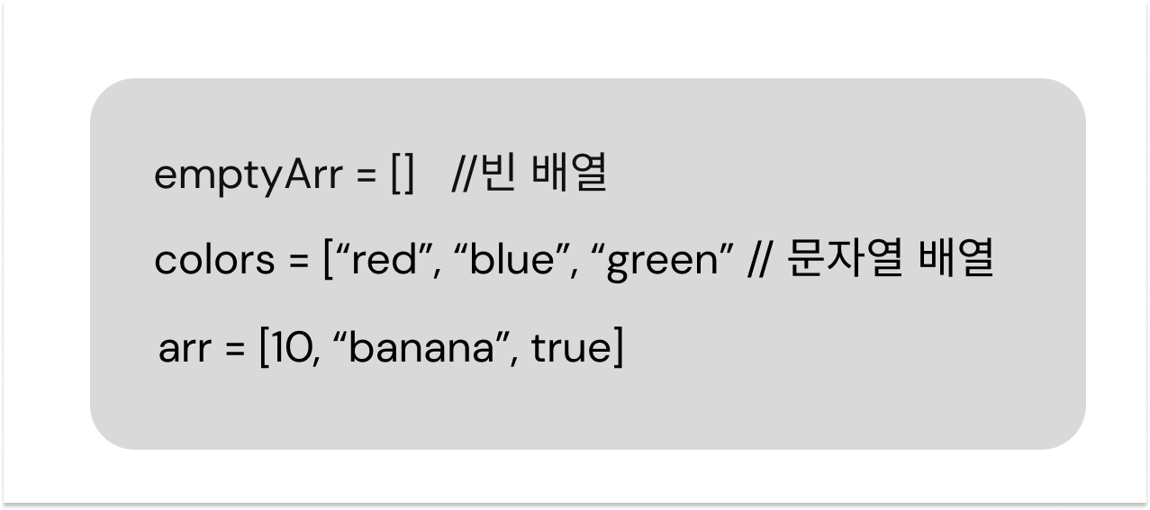 배열은 대괄호([])로 묶고 그 안에 값을 나열하는데, 각 값은 쉼표(,)로 구분합니다.