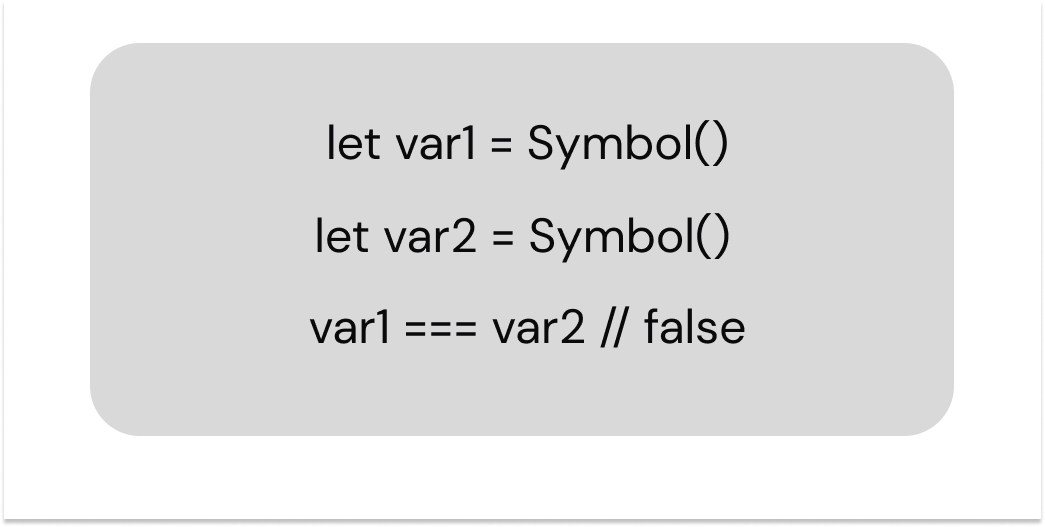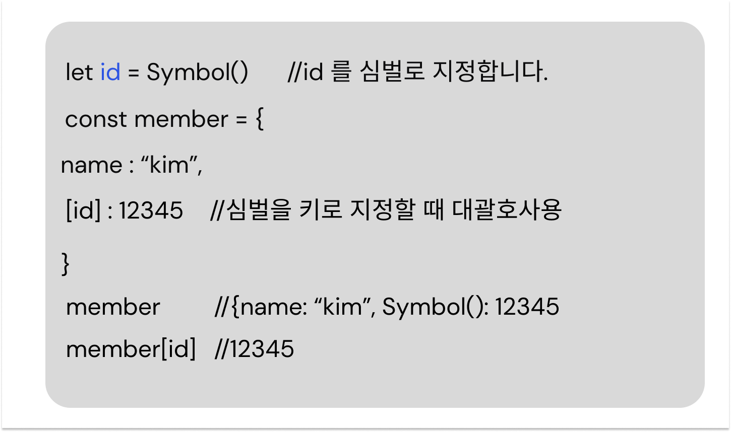 Symbol()함수를 사용하며 한 번 만들면 변경할 수도 없고, 같은 값을 가진 심벌을 만들 수도 없습니다.