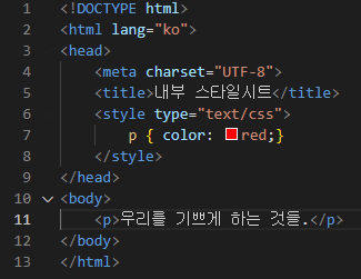 CSS를 HTML 문서 안에 <style> 태그로 기재 하여 HTML 문서 안에 CSS가 함께 저장되도록 하는 형태.