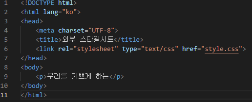 스타일 속성들을 따로 저장하여 HTML 문서에 파일명으로 연결할 수 있습니다. 이때 스타일은 .css확장자를 가진 별도파일로 저장하고, HTML에소는 <link> 태그를 이용합니다.