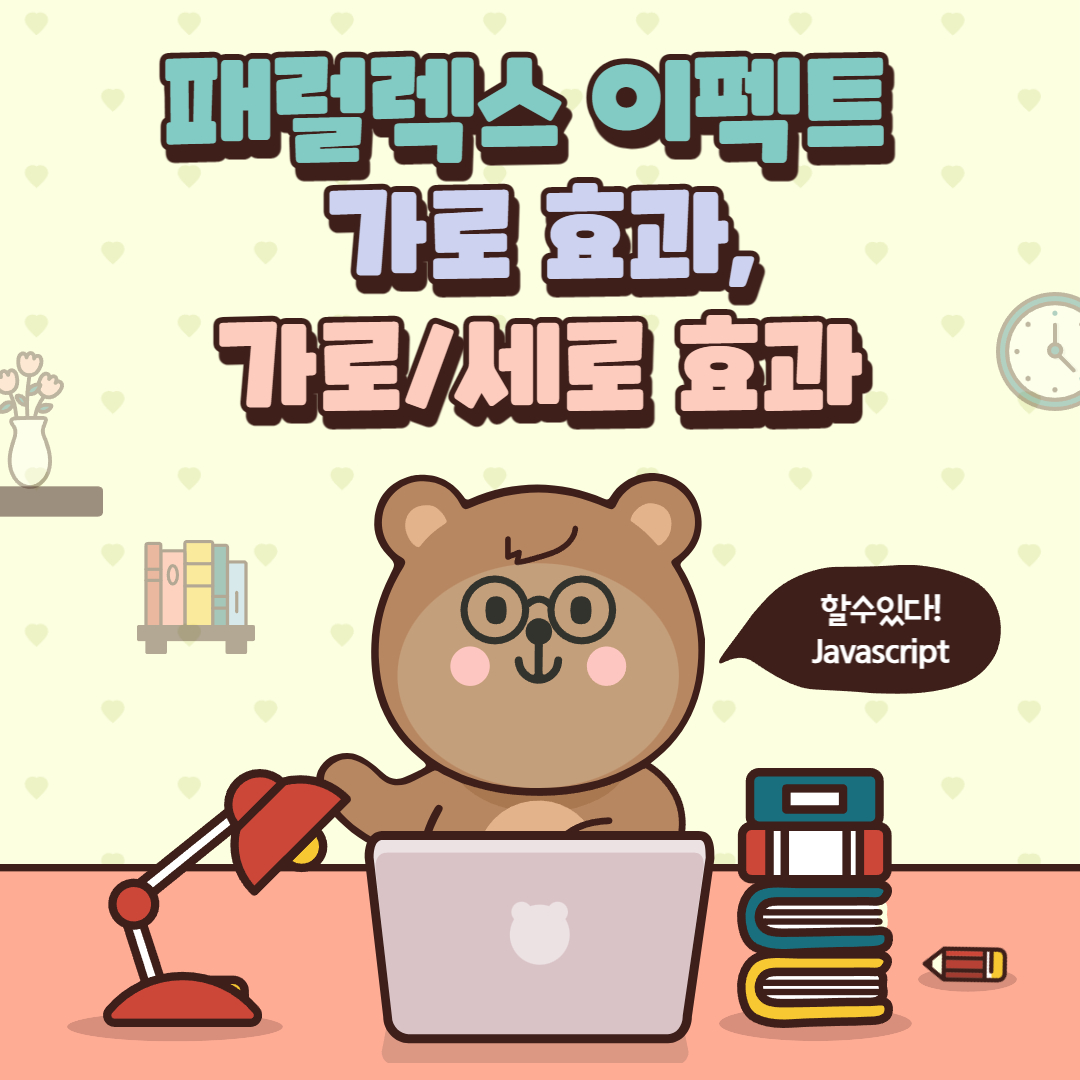 가로 효과 전체 소스 1. const parallaxCont = document.querySelector(".parallaxs__wrap");: parallaxs__wrap 클래스를 가진 요소를 선택하여 parallaxCont 변수에 할당합니다. 이 요소는 패럴랙스 효과를 적용할 부분을 감싸는 컨테이너입니다. 2. let scrollTop = window.pageYOffset;: scrollTop 변수에 현재 스크롤의 수직 위치를 저장합니다. 3. let parallaxWidth = parallaxCont.offsetWidth;: parallaxCont 요소의 너비를 저장하는 parallaxWidth 변수를 생성합니다. 4. document.body.style.height = parallaxWidth +..